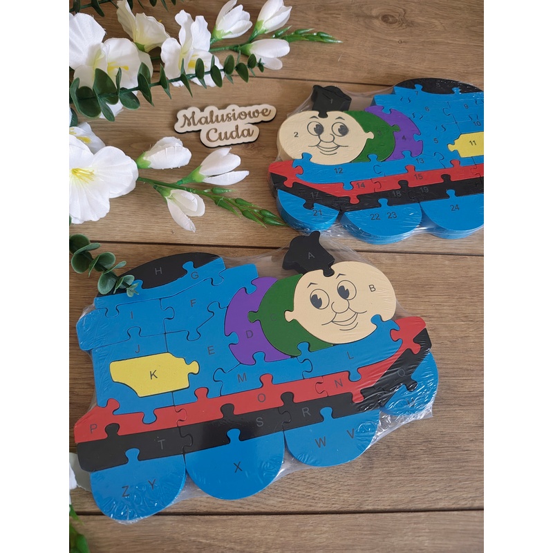 - Układanka jest dwustronna – z jednej strony posiada literki, a z drugiej liczby.