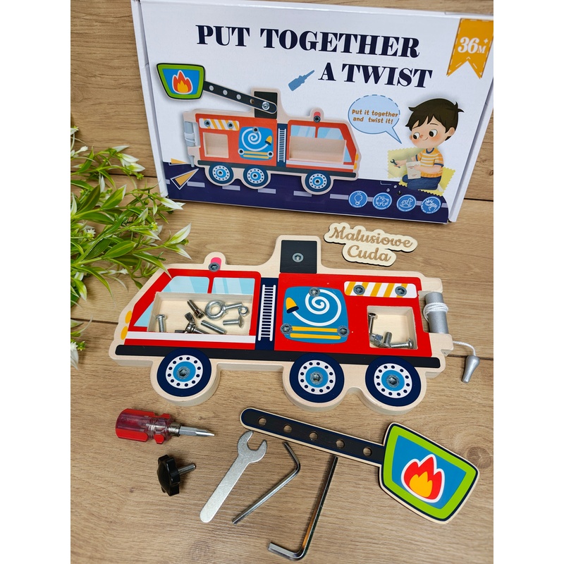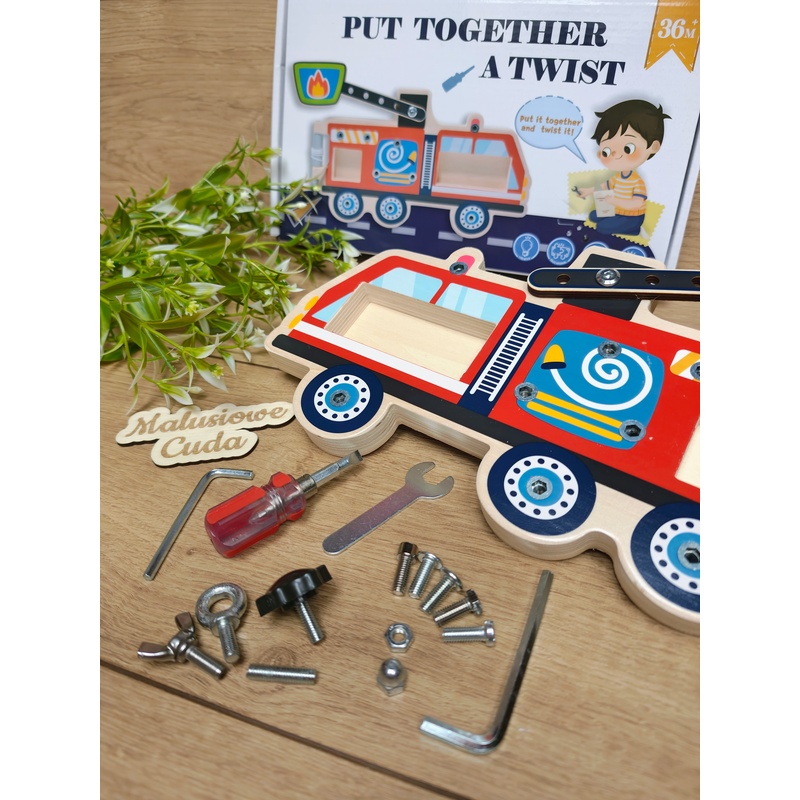 Zabawka w większości wykonana z drewna. Przybory do wkręcania oraz śruby – metalowe.